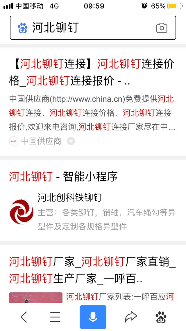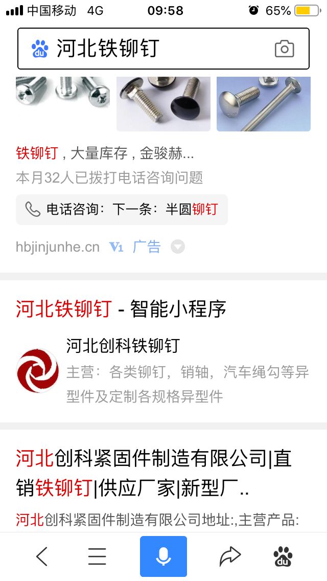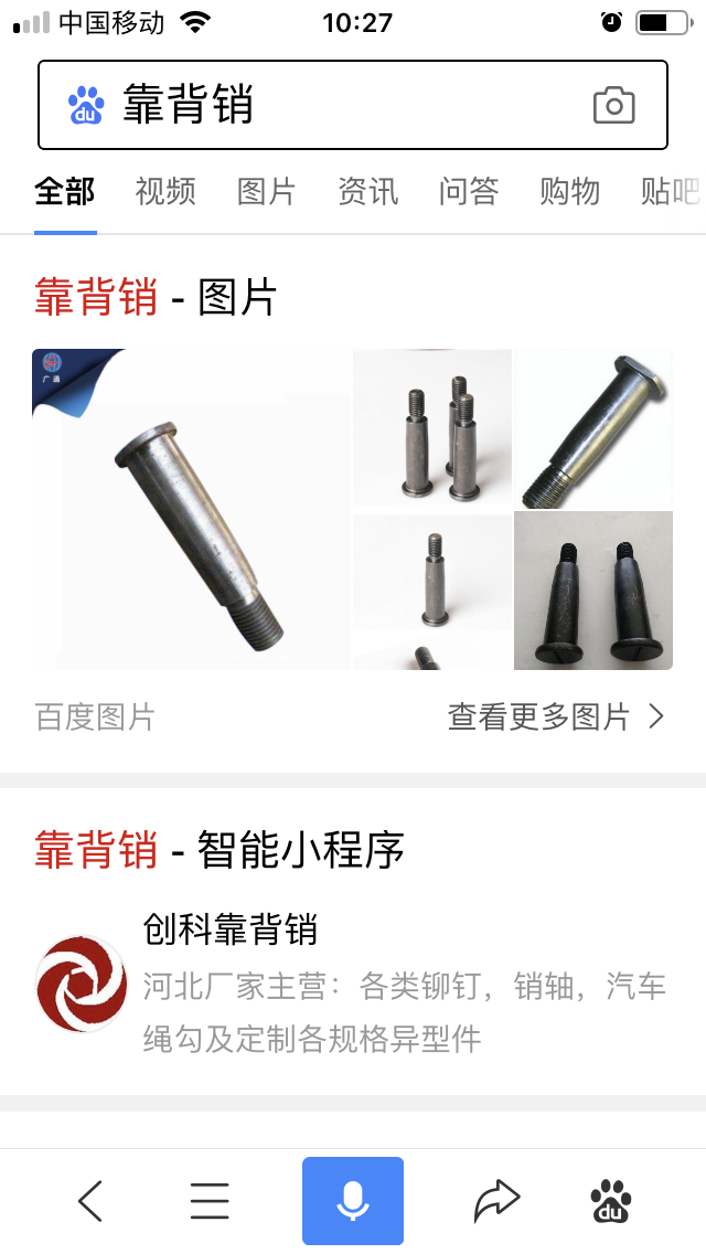 百度小程序:創(chuàng)科鉚釘、河北創(chuàng)科鐵鉚釘、河北創(chuàng)科銷軸、創(chuàng)科汽車繩勾、創(chuàng)科靠背銷、創(chuàng)科減速帶釘、創(chuàng)科平頭鉚釘、創(chuàng)科開口銷、創(chuàng)科異型銷軸